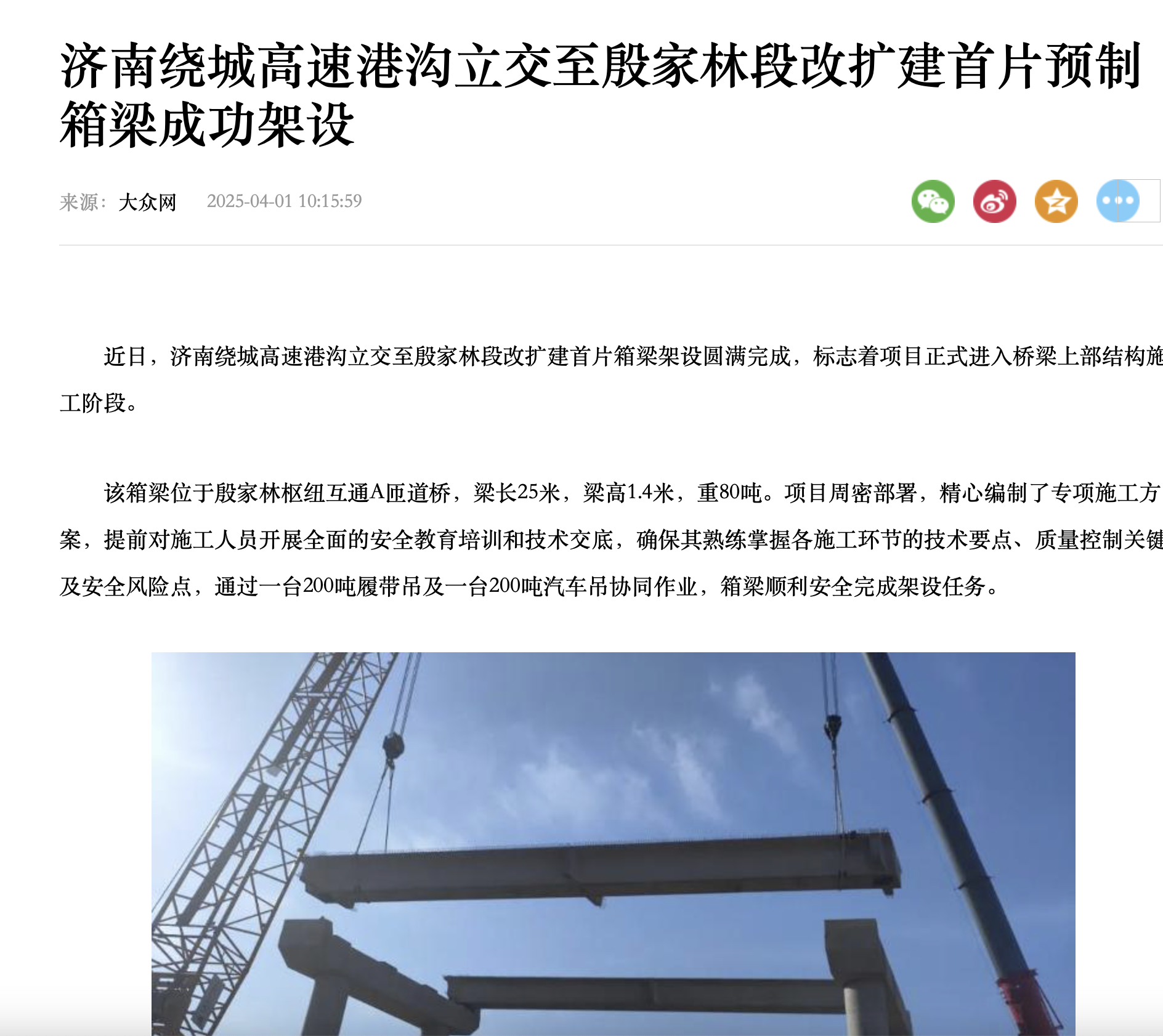 【大眾網】濟南繞城高速港溝立交至殷家林段改擴建首片預制箱梁成功架設